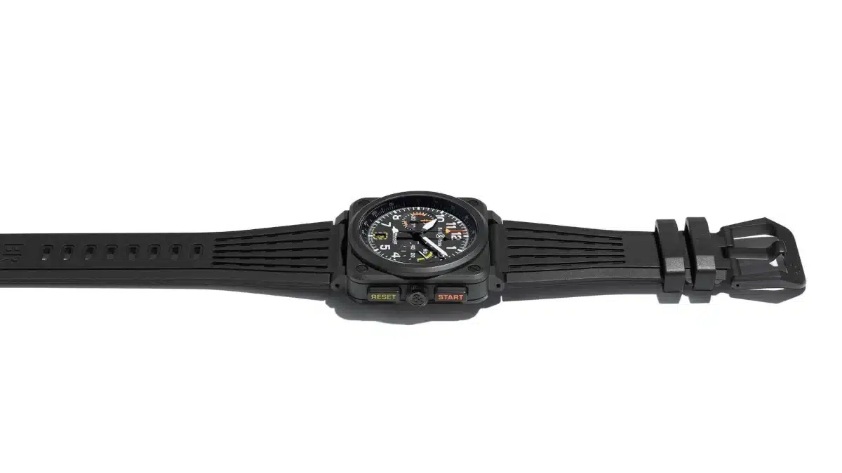 La caixa quadrada de 42 mm en ceràmica negra microgranular remet directament al llenguatge visual dels instruments de cabina. L’esfera negra mat, amb números i agulles recoberts de Super-LumiNova® X1, garanteix màxima llegibilitat en qualsevol situació. Els detalls en taronja i groc evoquen els codis de senyalització dels avions militars, mentre que els polsadors “START” i “RESET” accentuen la seva essència de rellotge-eina.