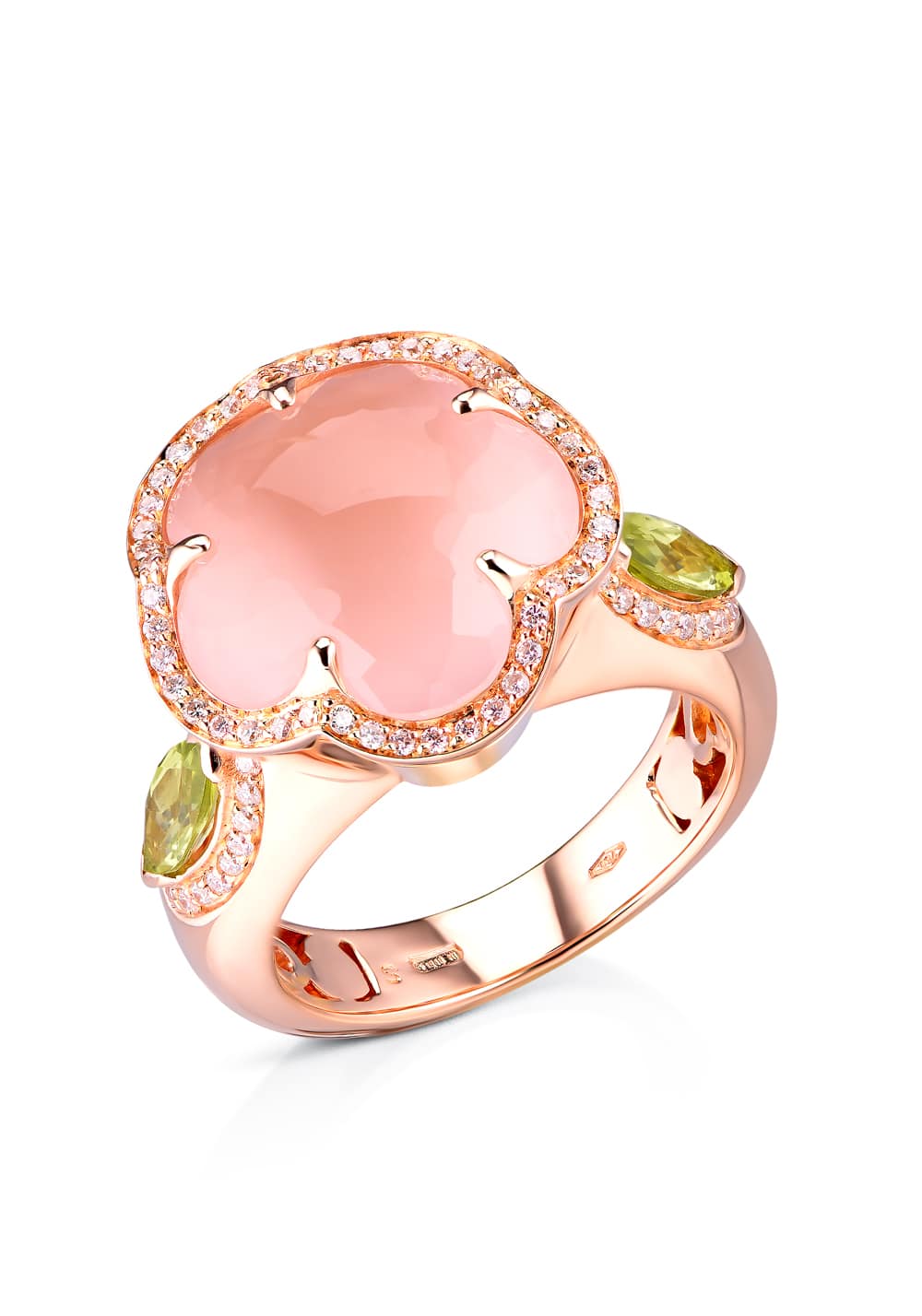 Anell Pasquale Bruni Glori d’or vermell, diamants, quars rosa i peridot.