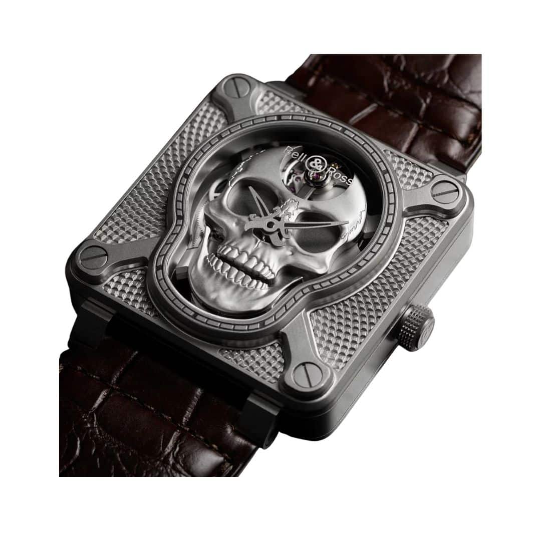 La seva emblemàtica caixa quadrada de 46 mm en acer microgranular amb acabat setinat presenta cargols visibles i emmarca una esfera negra dominada per una calavera en 3D. Aquesta calavera no és només decorativa: quan es remunta el moviment mecànic manual BR-CAL.206, la mandíbula s’obre i sembla que riu, afegint un toc teatral i distintiu que dona nom al model.