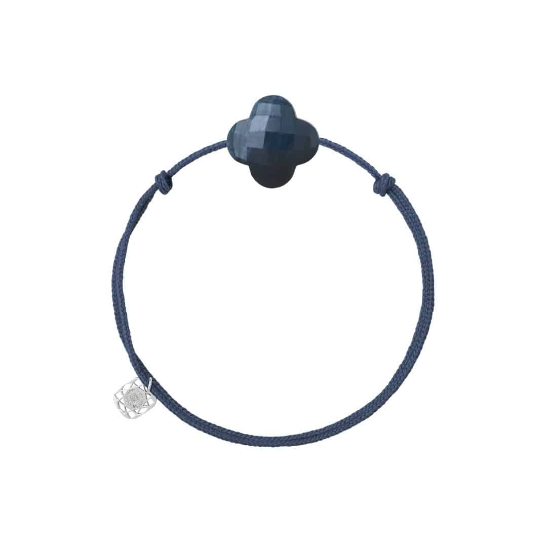 Braçalet Morganne Bello Friandise, cordó blau texà, trèvol pietersite blau i argent