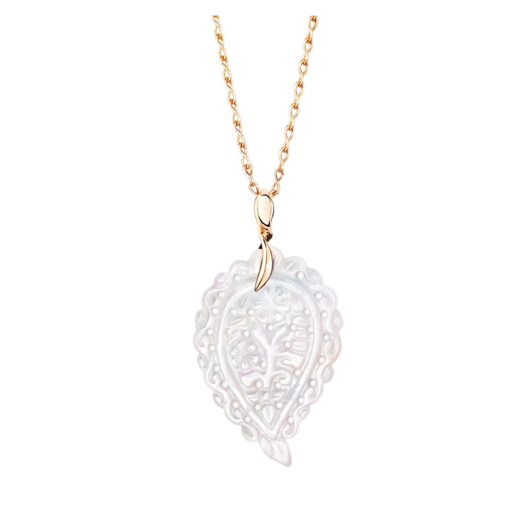 El penjoll Tamara Comolli India MM d’or rosa i nacre blanc presenta una delicada fulla de nacre, polida a mà amb cura i detall.