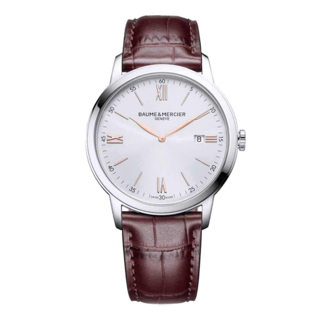 Rellotge Baume & Mercier Classima de 42 mm de diàmetre, caixa d’acer i braçalet de cuir, esfera platejada i moviment de quars
