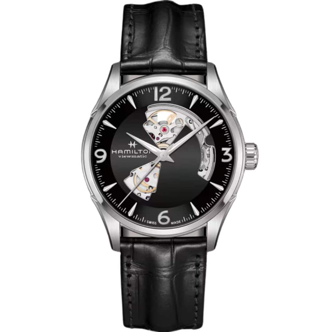 Rellotge Hamilton Jazzmaster Open Heart de 42 mm de diàmetre, caixa d’acer, braçalet de cuir, esfera negra i moviment automàtic.