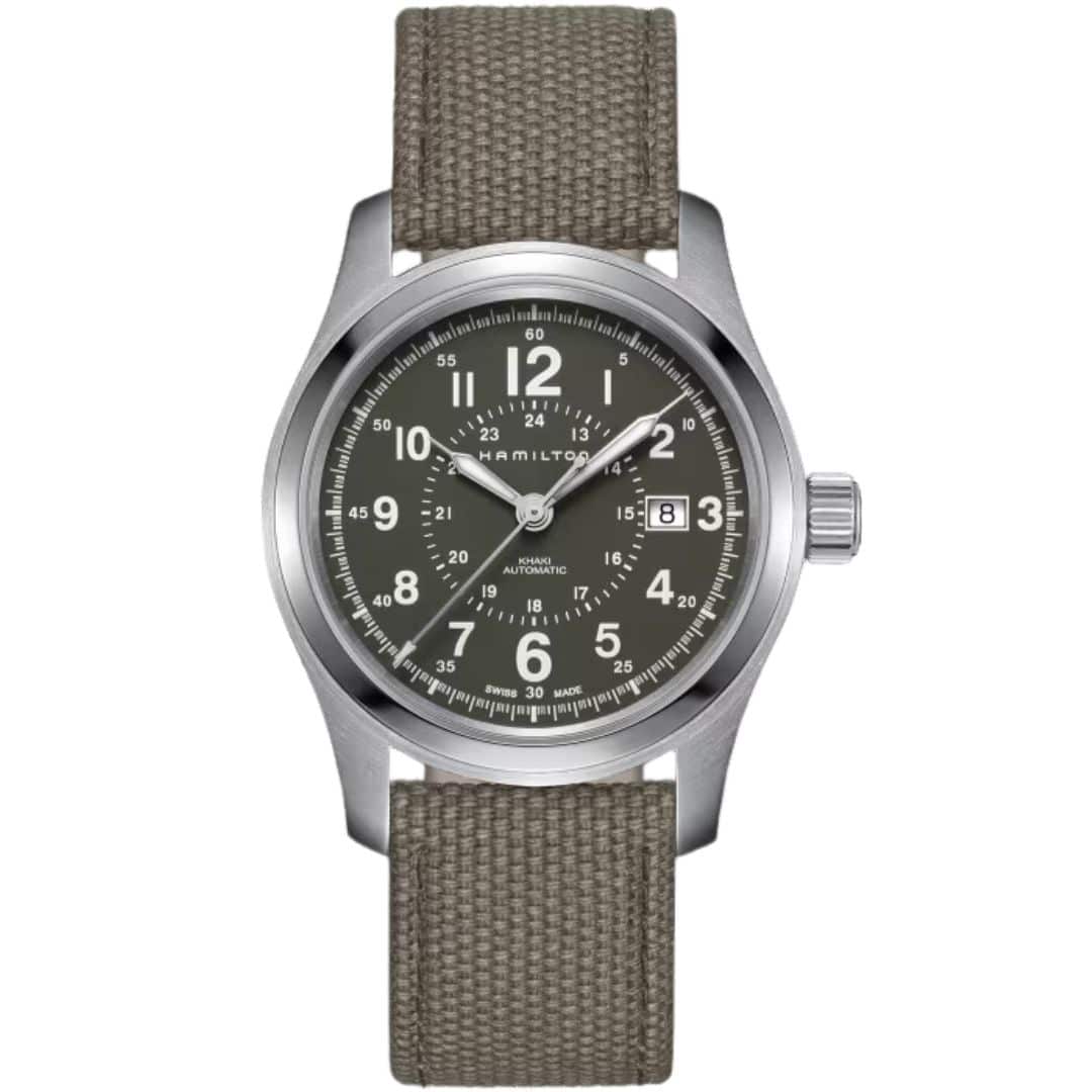 Rellotge Hamilton Khaki Field de 42 mm de diàmetre, caixa d’acer, braçalet de tèxtil, esfera verda i moviment automàtic
