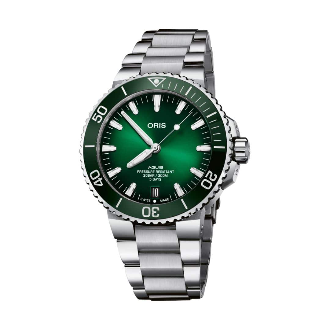 Rellotge Oris Aquis Date de 43,50 mm de diàmetre, caixa i braçalet d’acer, esfera verda