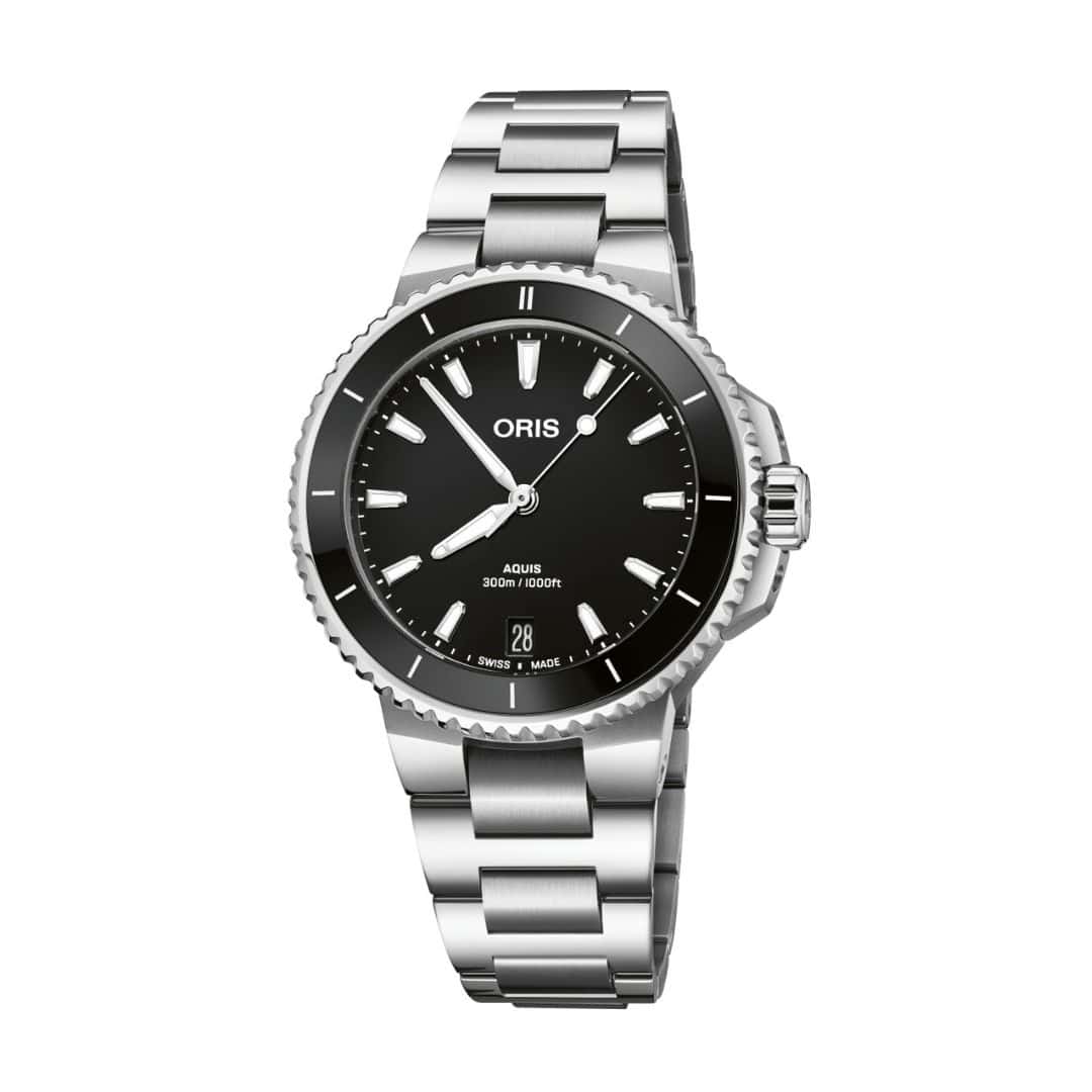 Rellotge Oris Aquis Date de 36.50mm de diàmetre, caixa i braçalet d’acer, esfera negra