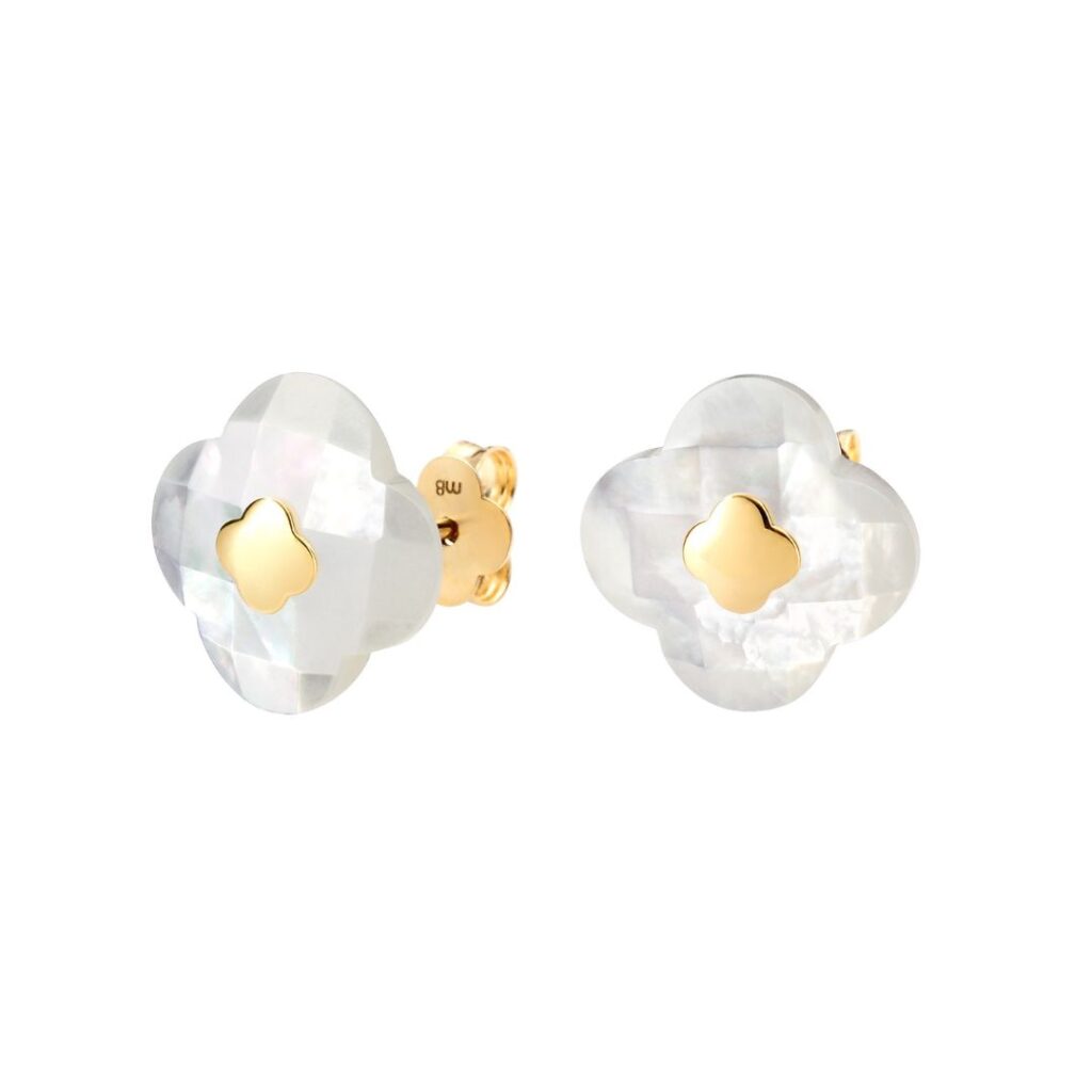 MORGANNE BELLO VICTORIA STUD EARRINGS, WHITE MOTHER OF PEARL AND YELLOW GOLD CLOVER