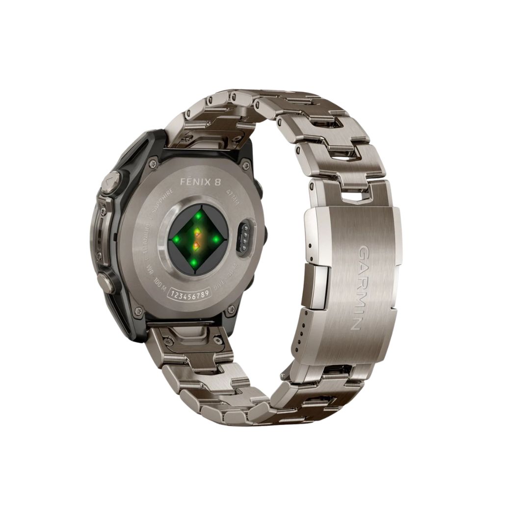 Garmin Fenix 8 AMOLED watch with a 47mm diameter, titanium case and strap.