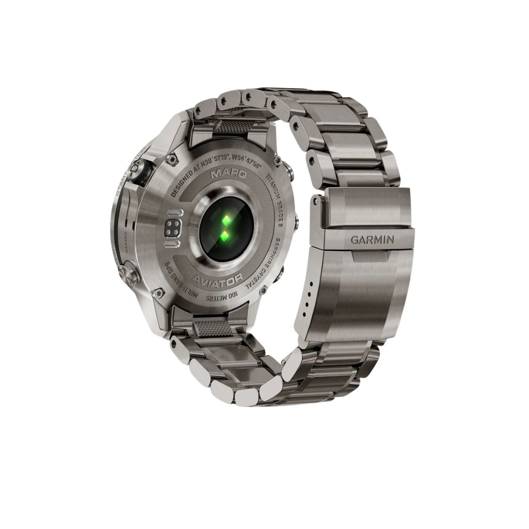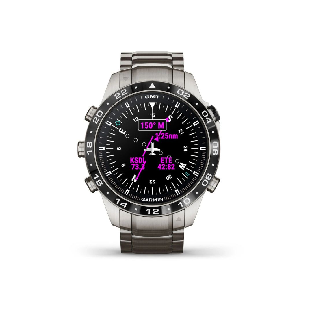 The Garmin Marq Aviator Gen 2 watch, with a titanium case and bracelet, offers exceptional battery life and is ready to accompany you on all your adventures thanks to its rechargeable lithium battery. It is a modern, luxurious, and specialized watch, designed with a titanium bracelet perfect for high-speed flights. In addition, it features a high-quality AMOLED touchscreen and traditional control buttons, all within a 46 mm titanium case.