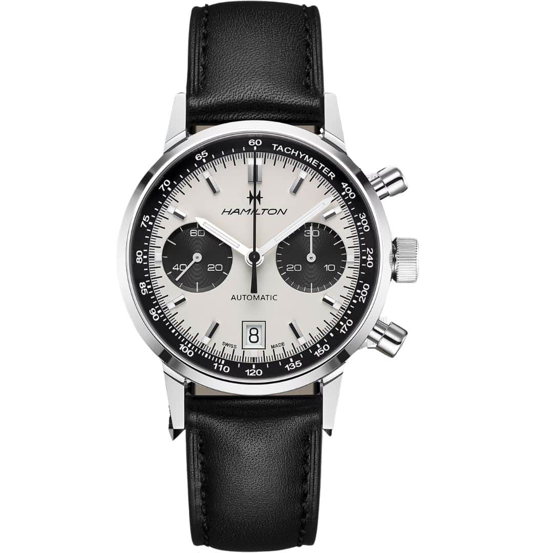 Hamilton American Classic Intramatic 40 mm watch, steel case, leather strap, white dial and automatic chronograph movement.