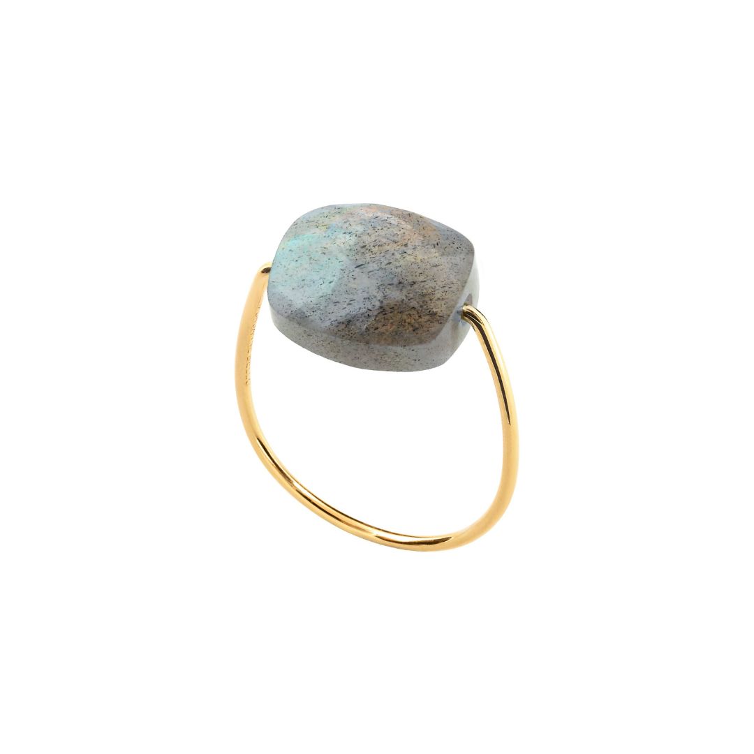Morganne Bello Friandise Intemporels ring, labradorite cushion and yellow gold.