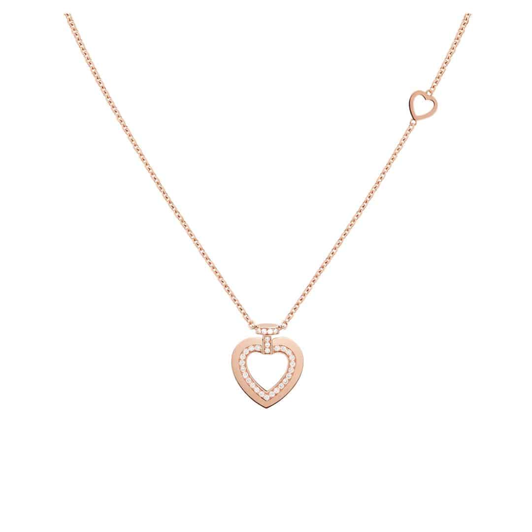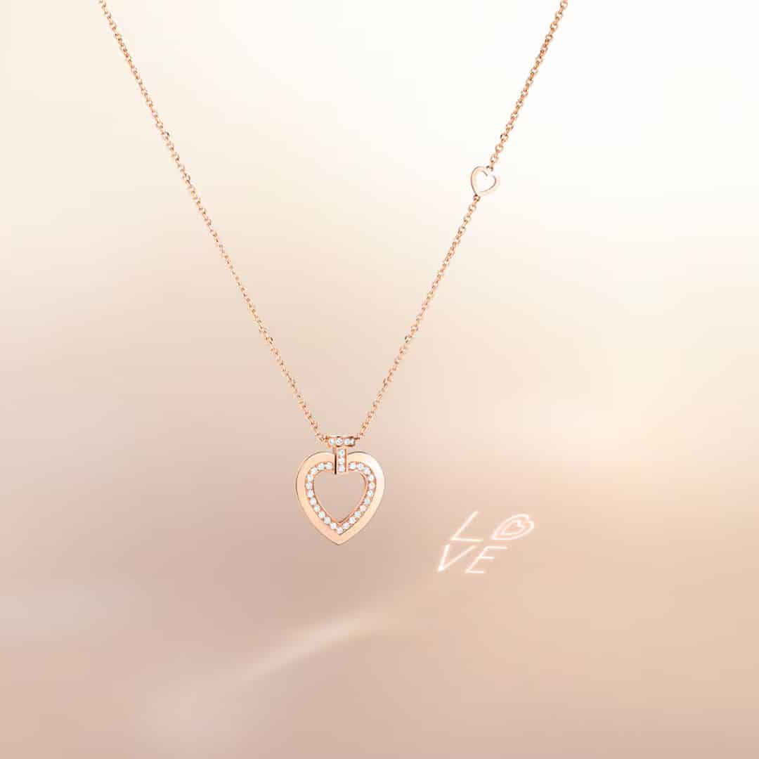 Fred Pretty Woman Sunlight “LOVE” PM necklace in rose gold with pavé diamonds. Only rays of light can uncover a secret message engraved on the back of the jewel, evoking the sun’s reflections on the sea and creating fascinating caustics.