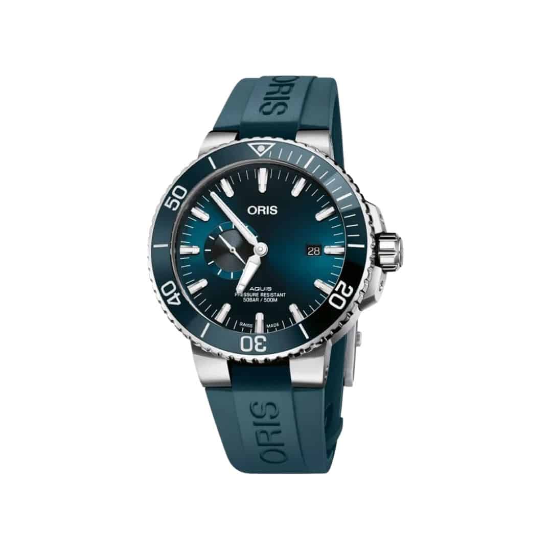 Oris Aquis Second Date PM 45.50mm diameter watch, steel case and rubber bracelet, blue dial