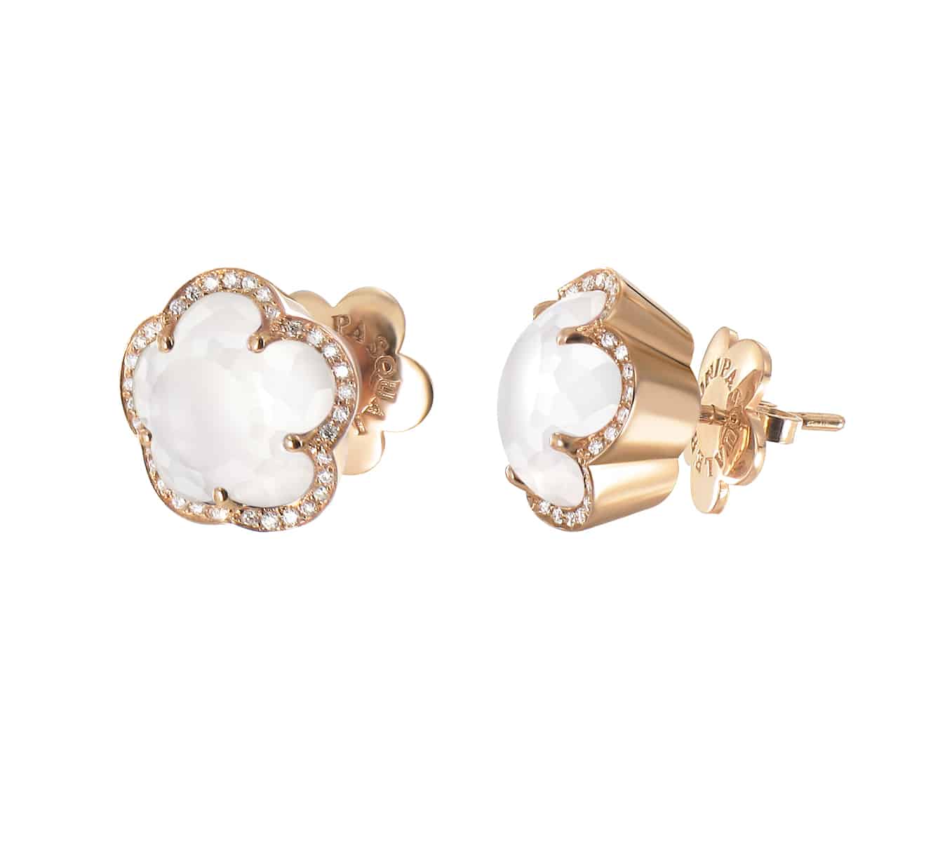 Pasquale Bruni Bon Ton earrings in red gold, diamonds, white quartz and mother of pearl.