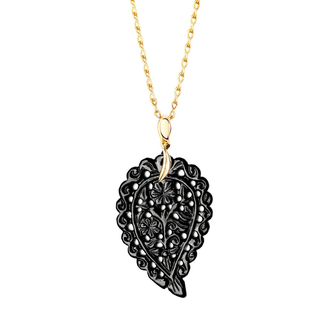 The medium-sized INDIA Leaf pendant features a refined black onyx leaf, carefully hand-carved with precision. It hangs lightly from an 18k yellow gold ring, adding a bold and stylish contrast. Available in three sizes, this versatile and sophisticated piece is perfect for layering and creating unique necklace combinations.