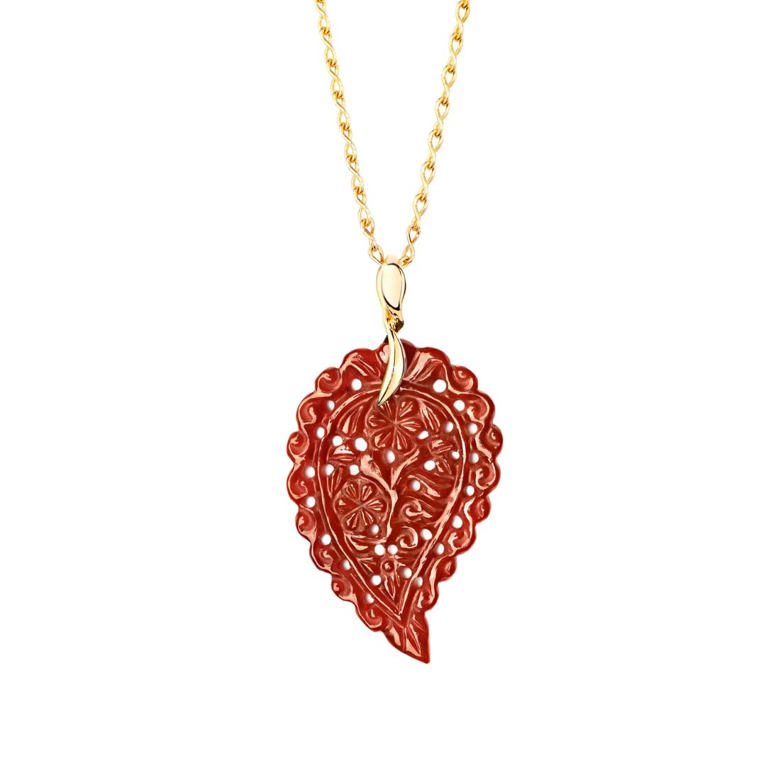 The medium-sized INDIA Leaf pendant stands out with its hand-carved leaf shape in rich terra-cotta onyx. Gently hanging from an 18k yellow gold ring, it adds a natural and sophisticated touch. Available in three sizes, it’s perfect for layering and bringing personality to your everyday style.