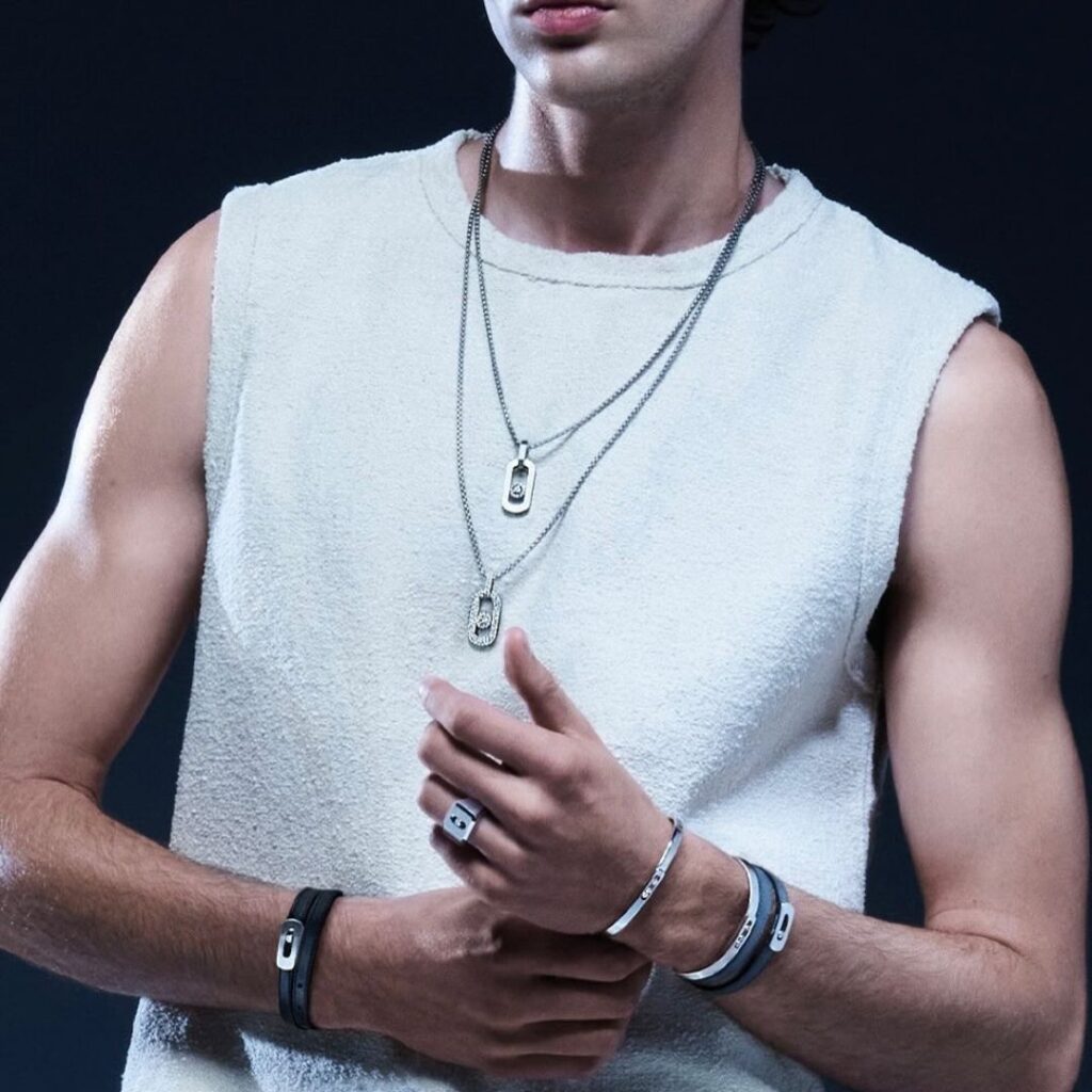 Messika ha roto esquemas al llevar los diamantes a la joyería masculina, incorporando el titanio como material estrella para sus piezas. El titanio, ligero y resistente, se asocia con un diseño moderno y minimalista, perfecto para el hombre que quiere destacar con elegancia y discreción. Tanto los anillos como los colgantes de diamantes elaborados en titanio son ideales para añadir un toque de brillo a los looks diarios, ya sea para un evento formal o una reunión casual.