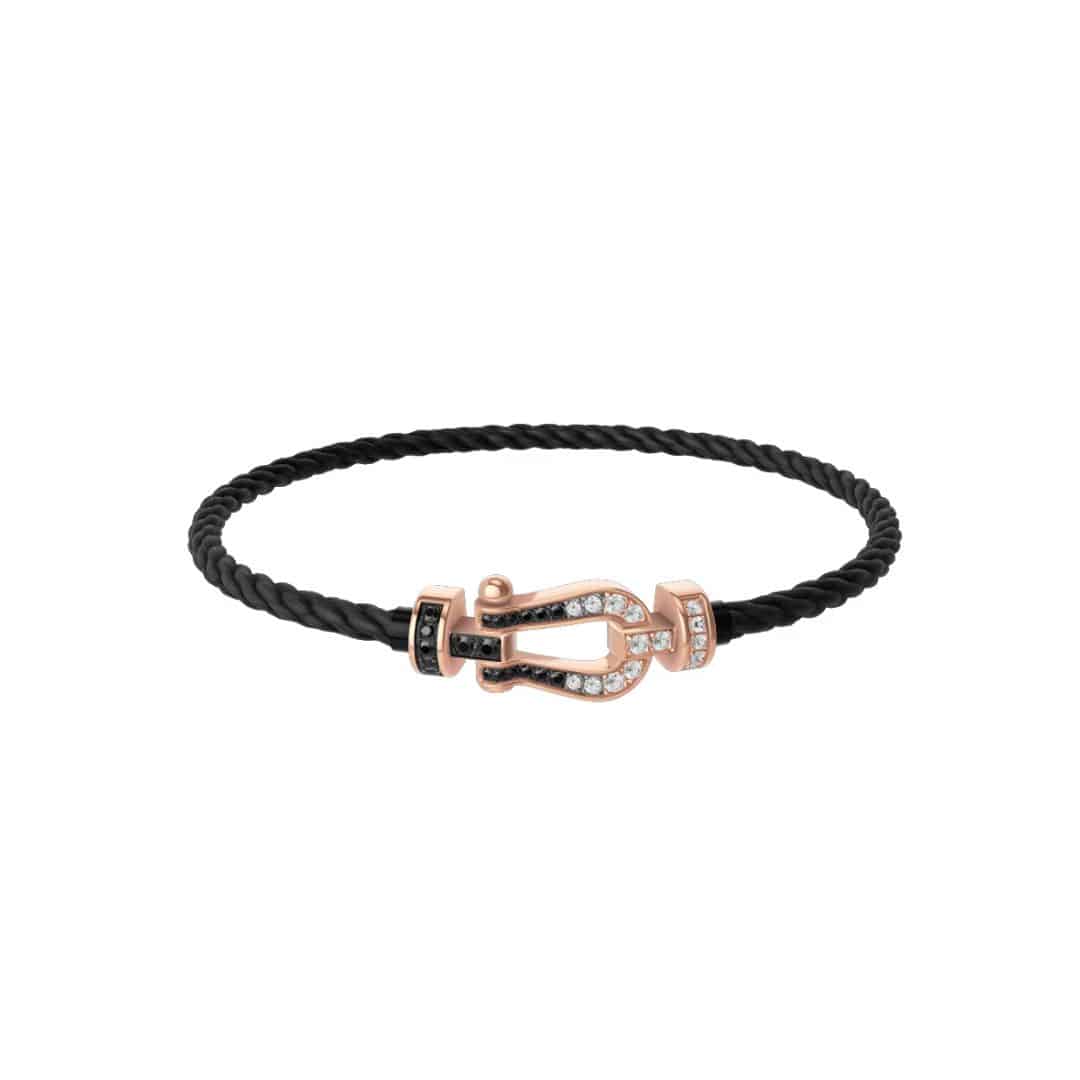 Pulsera Fred manilla Force 10 grande de oro blanco y diamantes blancos y negros. Consultar la variedad de colores de cables disponibles.