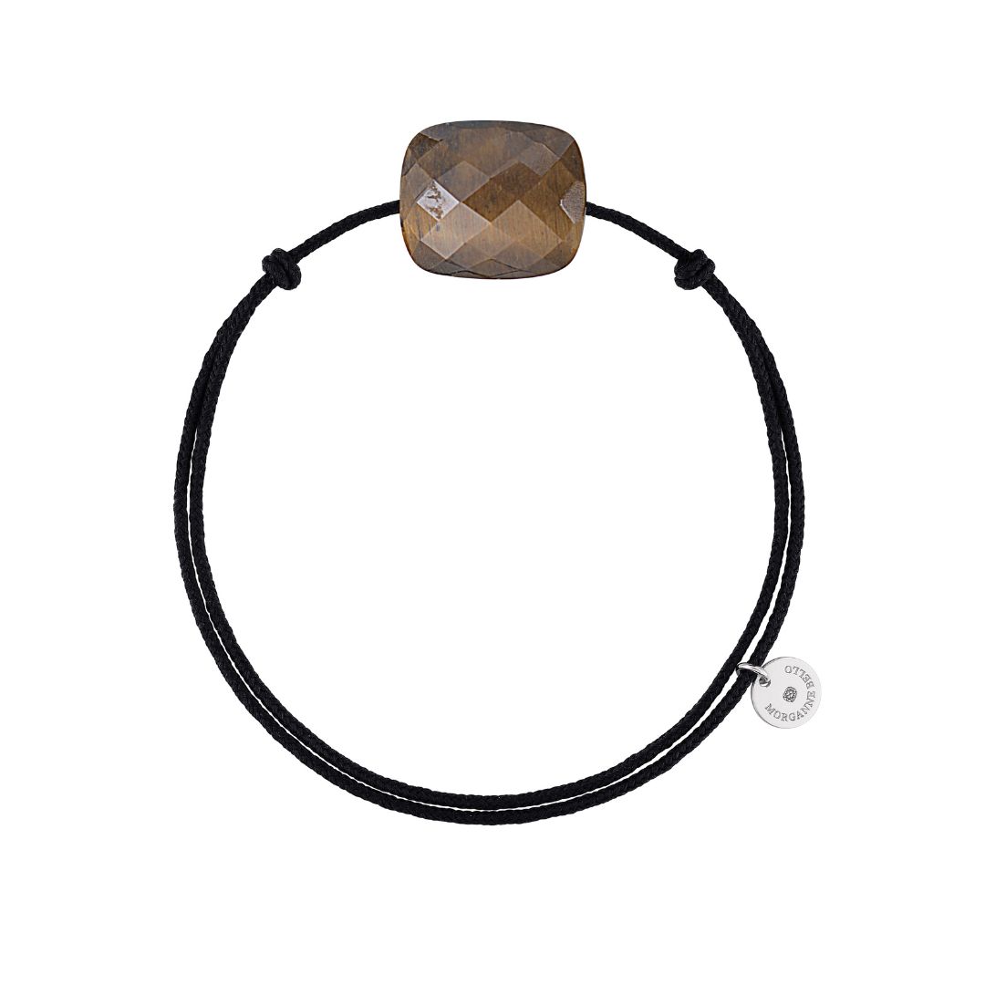 Pulsera Morganne Bello Friandise, cordón negro, cojín ojo de tigre miel y plata.