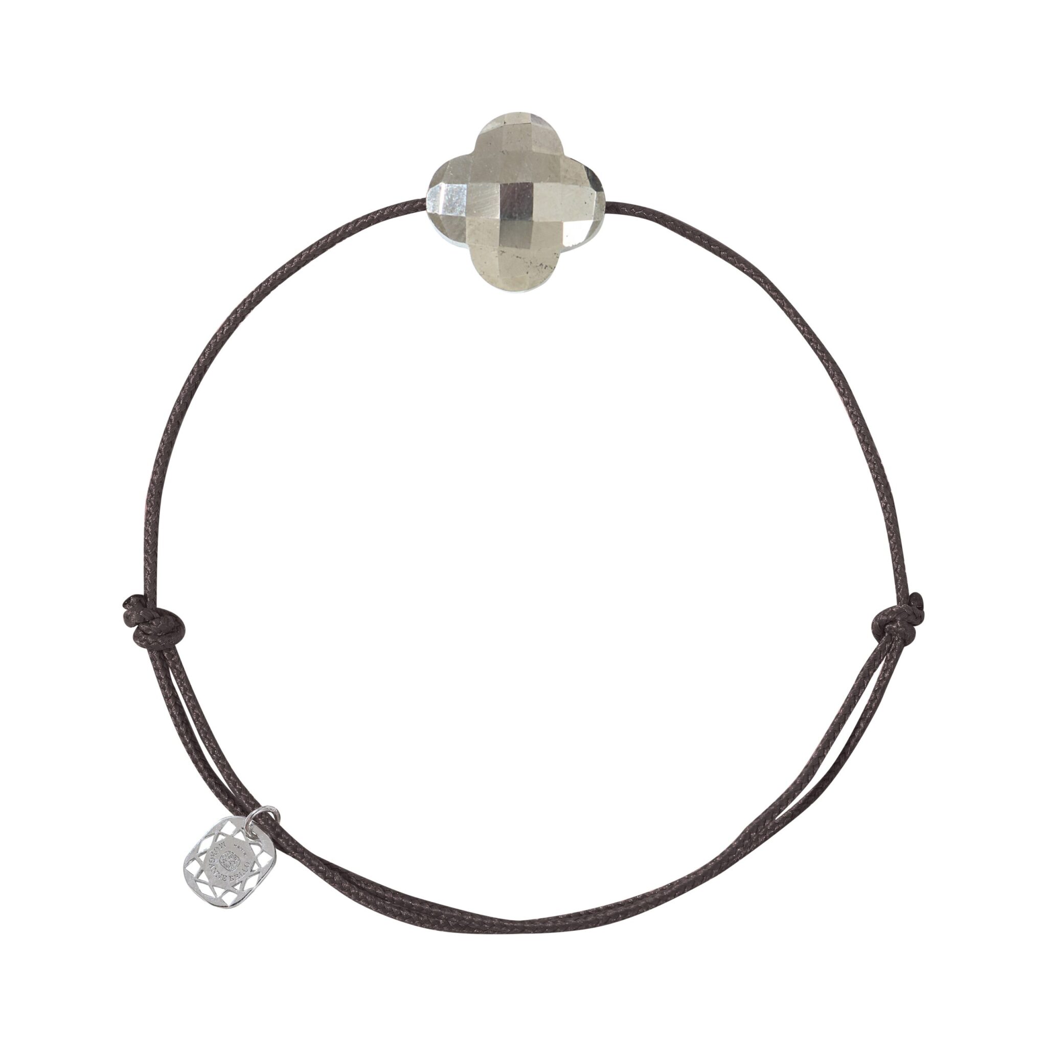 Pulsera Morganne Bello Friandise, cordón chocolate, trébol pirita y plata