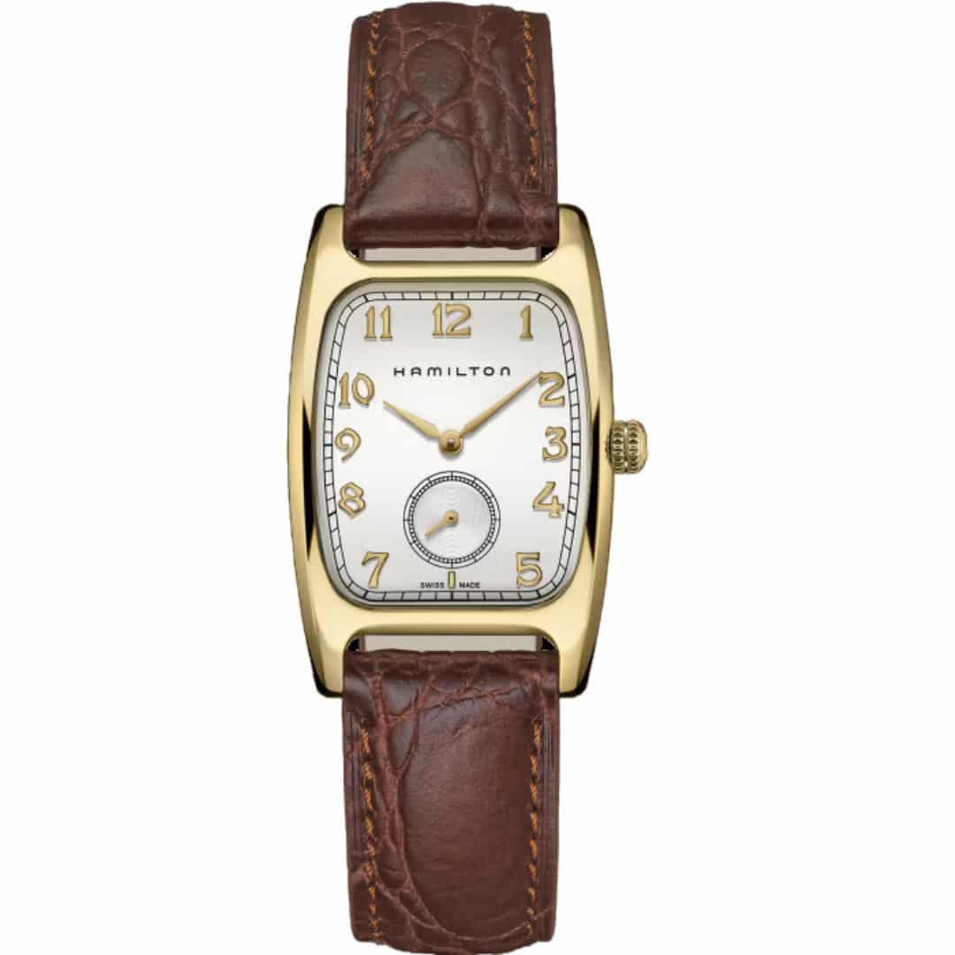 Hamilton American Classic Boulton de 31,6 mm de diámetro, caja de acero PVD oro, brazalete de cuero, esfera blanca y movimiento de cuarzo.
