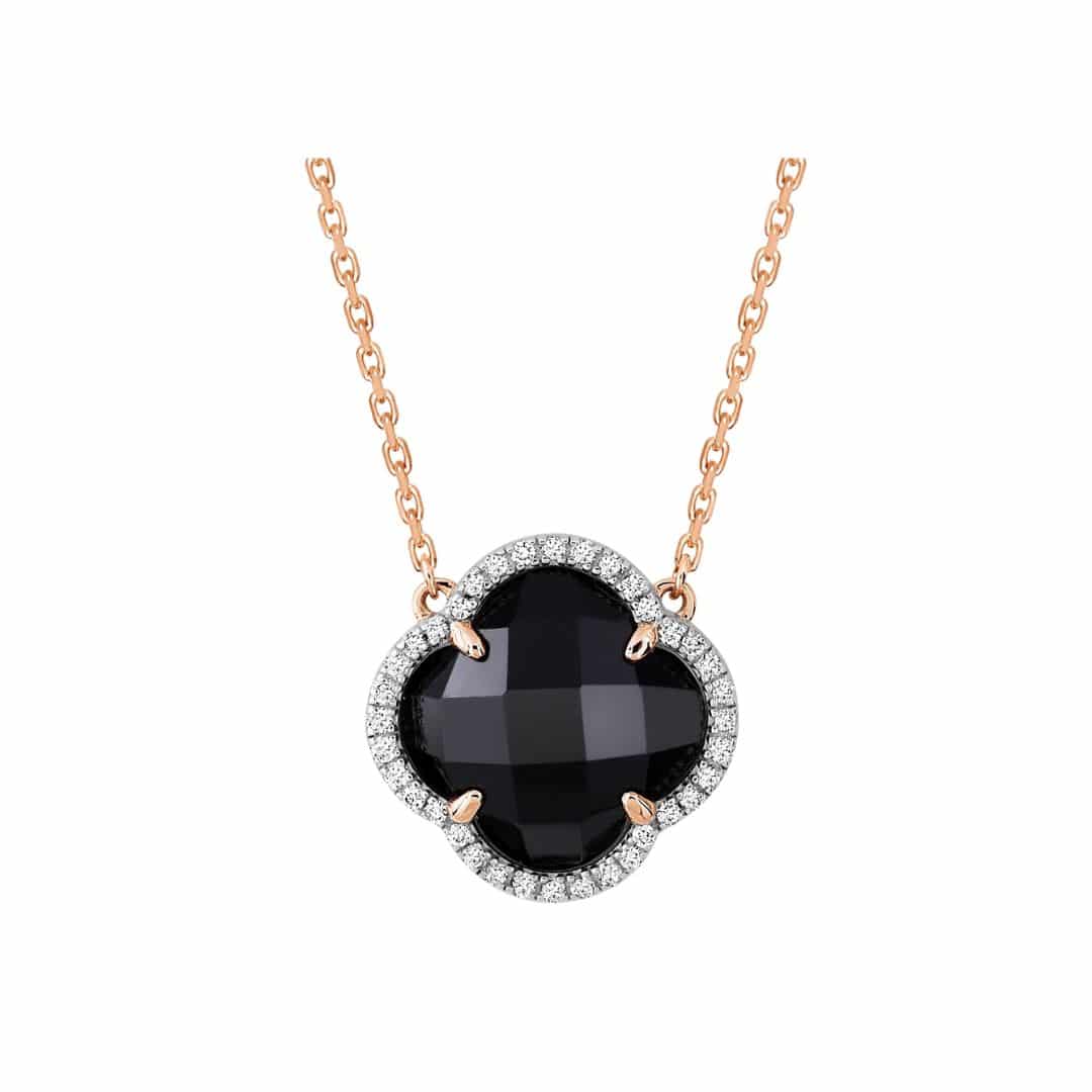Collier Morganne Bello Victoria Diamants, trèfle en onyx, or rose et diamants.