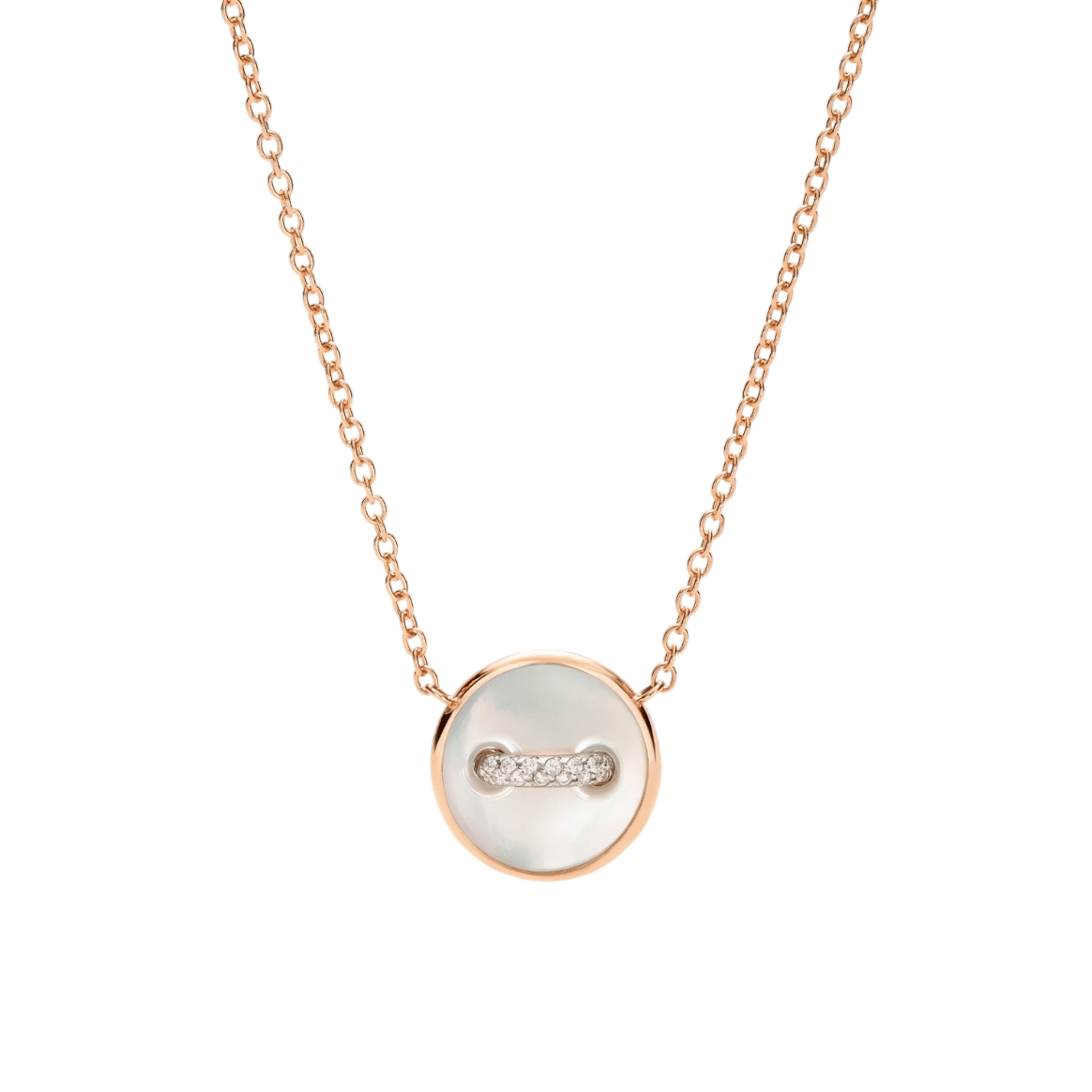 Collier réversible Pomellato Pom Pom Dot en or rose, diamants et nacre blanche d’un côté et nacre grise de l’autre.