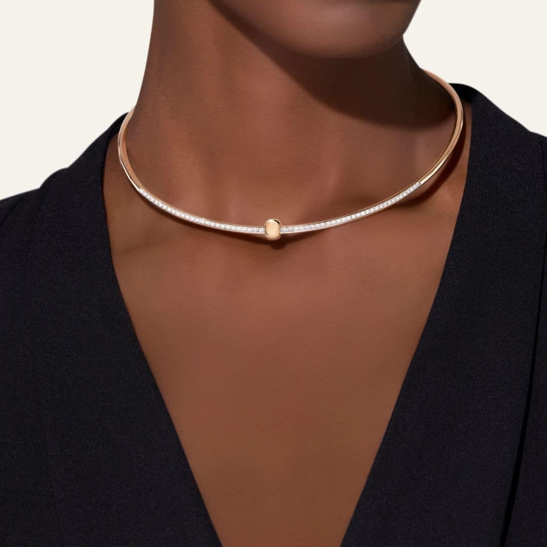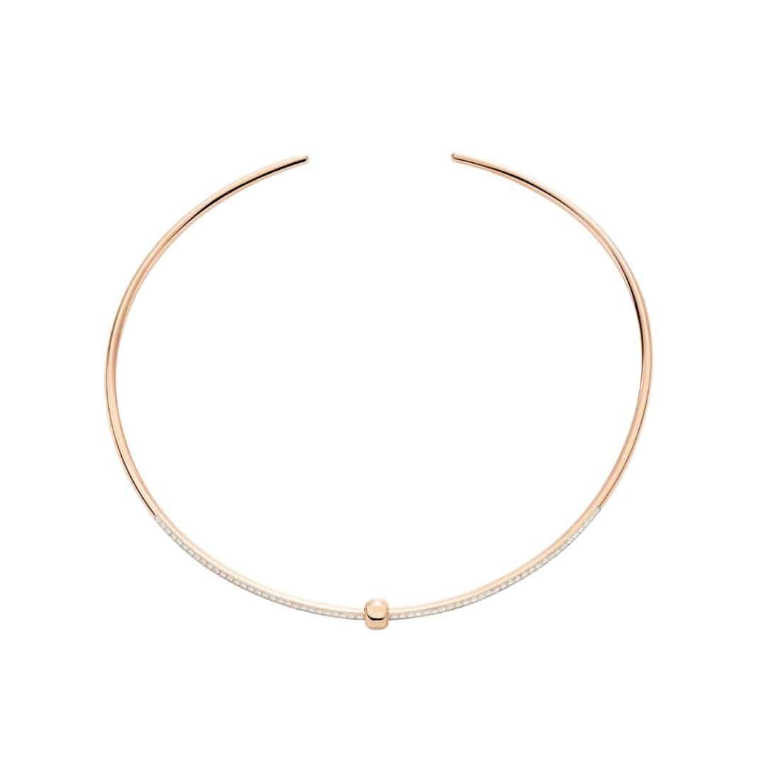 Profondément symbolique, la collection Pomellato Together célèbre les liens qui nous unissent et rend hommage à l’amour sous toutes ses formes. Ce collier distinctif au design flexible en jonc d’or rose, serti de diamants blancs éclatants, incarne la fusion parfaite entre confort raffiné et glamour.