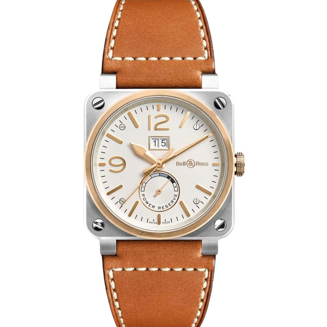 Montre Bell & Ross BR 03-90 acier et rose de 42 mm, boîtier en acier et or rose et bracelet en cuir, cadran opalin et mouvement mécanique automatique