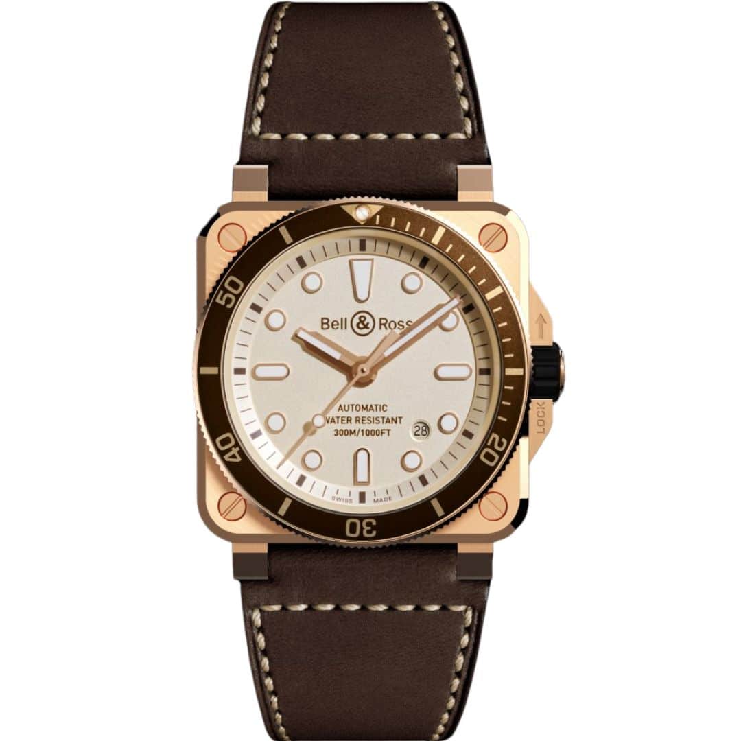 Montre Bell & Ross BR 03-92 Diver 42 mm blanc bronze de 42 mm, boîtier en bronze et bracelet en cuir, cadran argenté et mouvement mécanique automatique