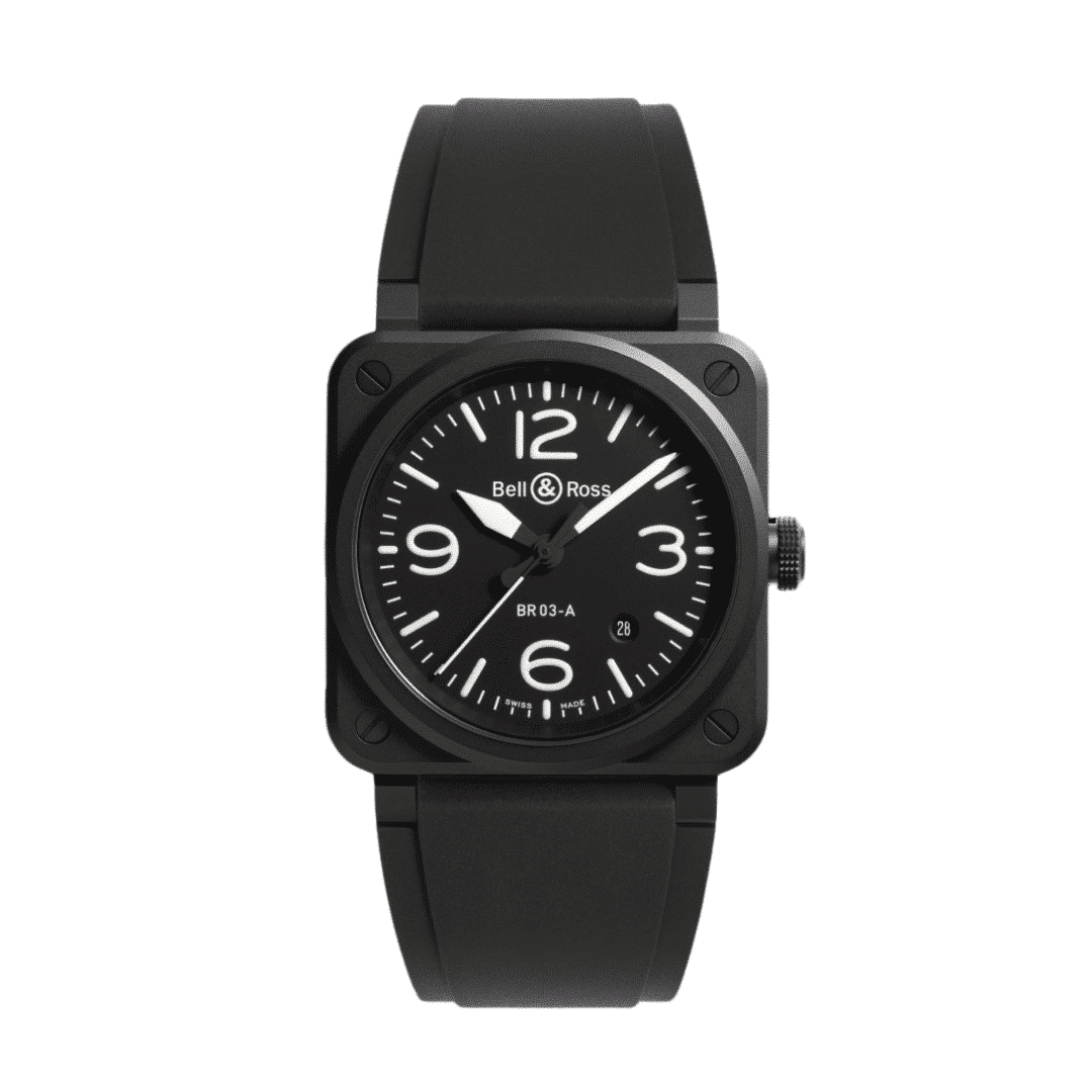 Montre Bell & Ross BR 03A de 41 mm, boîtier en céramique noir et bracelet en caoutchouc, cadran noir et mouvement mécanique automatique