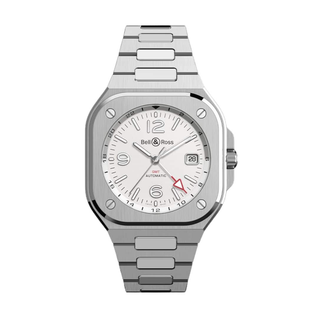 Montre Bell & Ross BR 05 GMT de 41 mm, boîtier et bracelet en acier, cadran argenté opalin et mouvement mécanique automatique