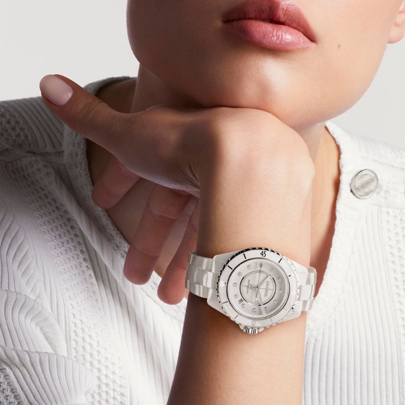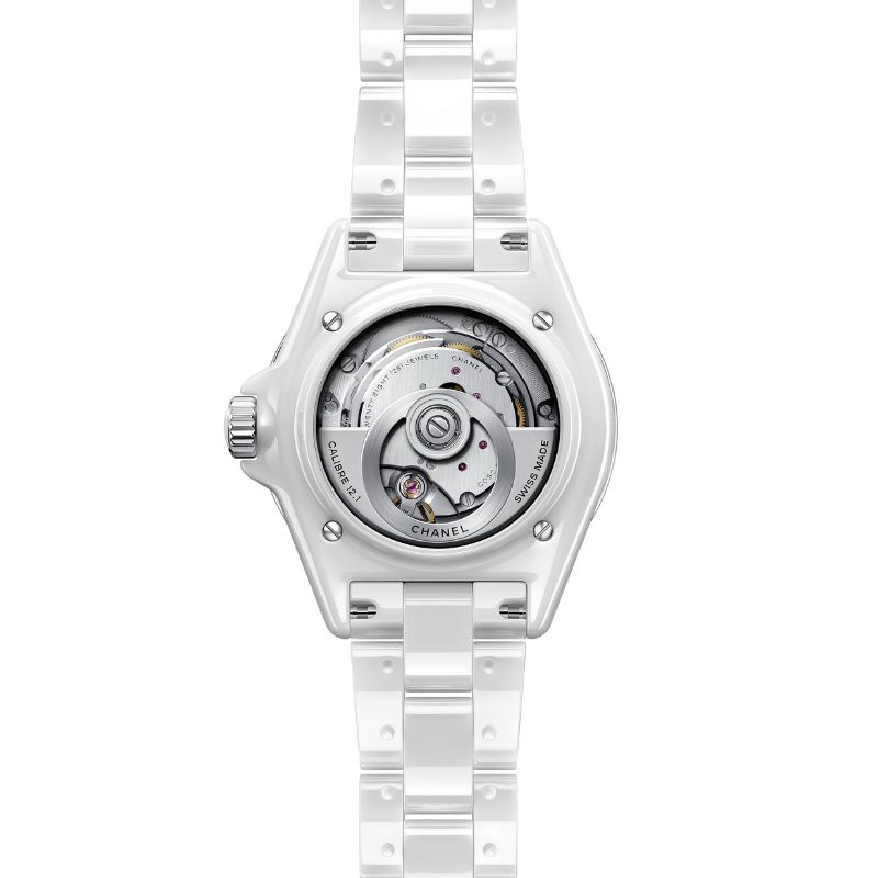 Montre Chanel J12 Calibre 12.1 de 38 mm de diamètre et mouvement automatique. La montre est en céramique blanche avec un cadran blanc et des index en diamants.