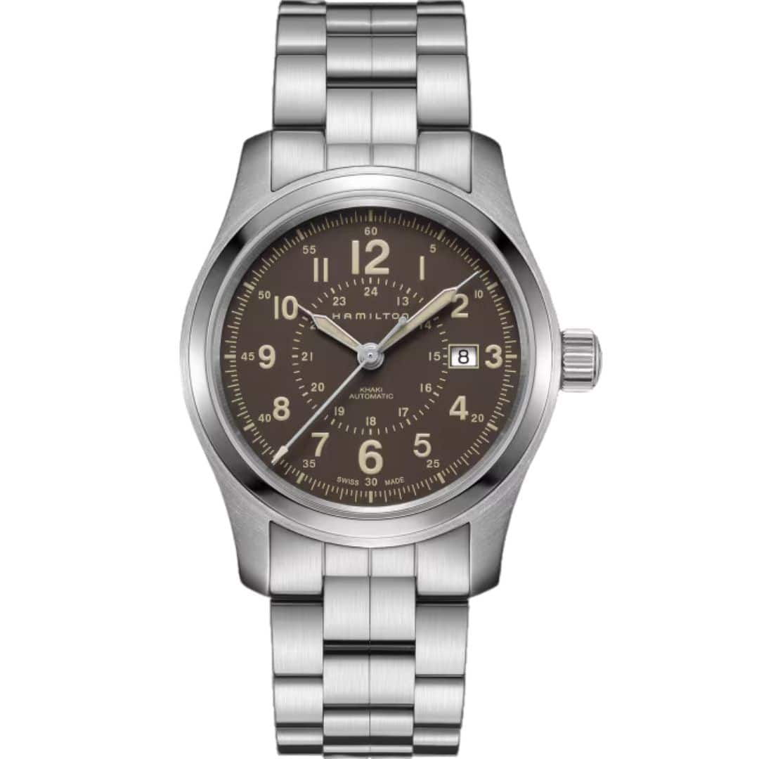 Montre Hamilton Khaki Field de 42 mm, boîtier et bracelet en acier, cadran marron et mouvement automatique