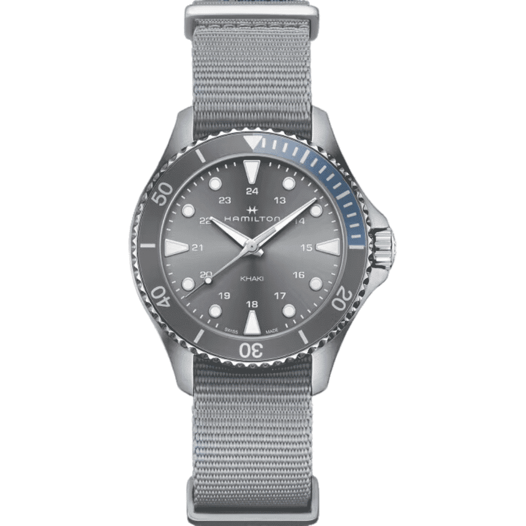 Montre Hamilton Khaki Navy Scuba de 37 mm, boîtier en acier, bracelet en textile, cadran gris et mouvement à quartz.