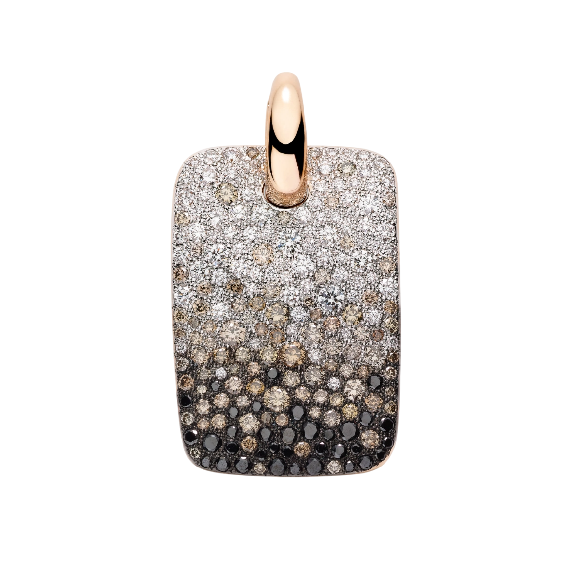 Pendentif Pomellato Sabbia en or rose, 92 diamants blancs sur or rose rhodié en blanc, 89 diamants marron sur or rose rhodié en noir et 34 diamants noir sur or rose rhodié en noir.